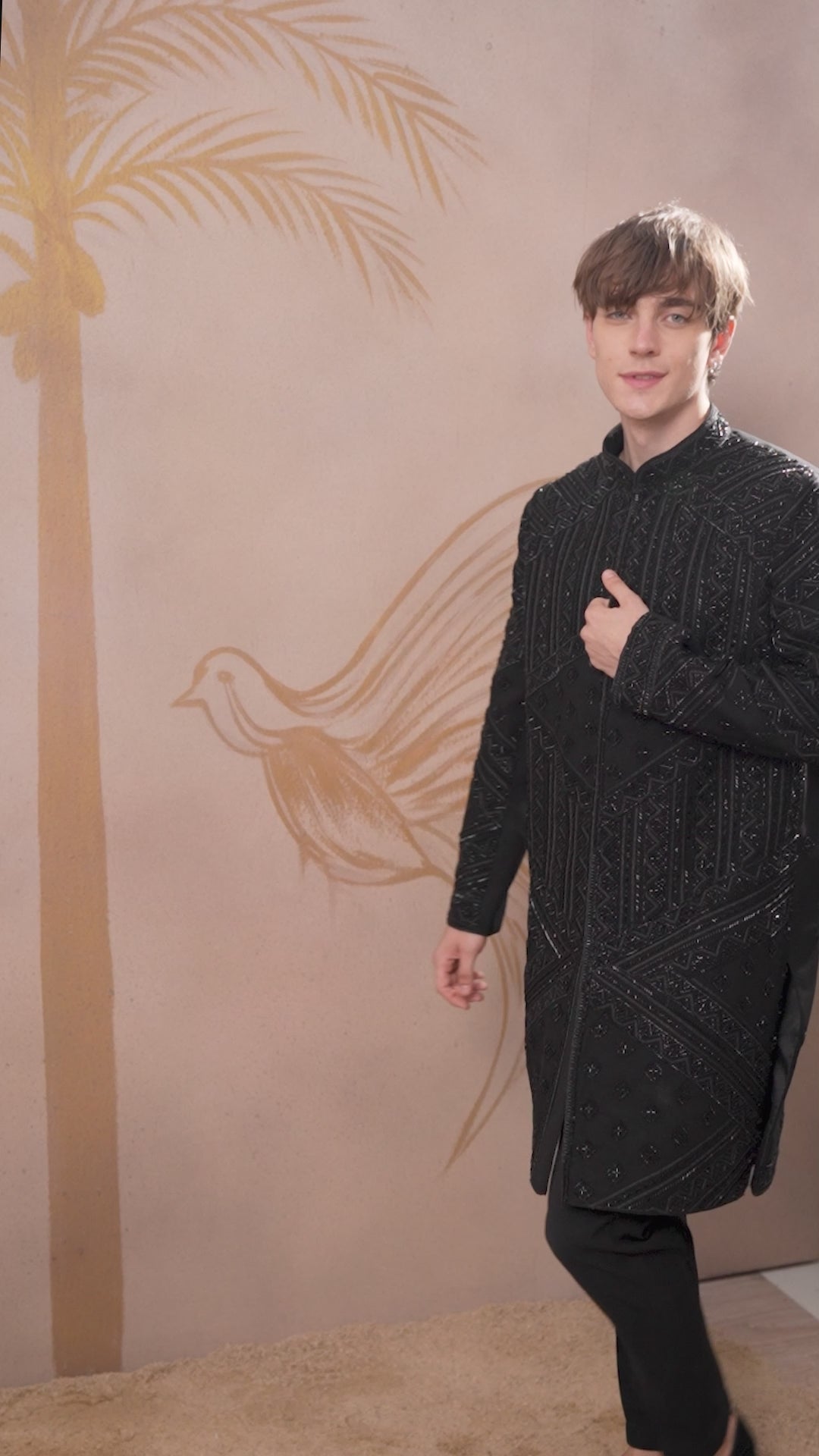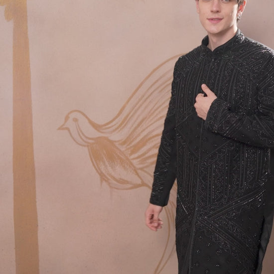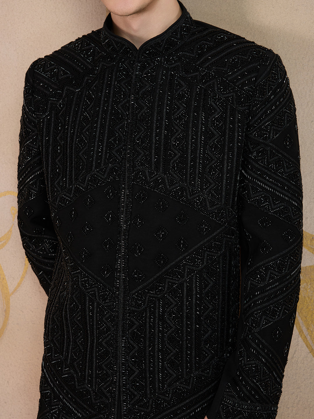 This sophisticated black sherwani is crafted with precision, showcasing intricate geometric beadwork and linear embroidery throughout the front and sleeves. The subtle yet striking embellishments give it a luxurious appeal, perfect for evening weddings, receptions, and high-profile festive celebrations. Paired with sleek black trousers and matching footwear, this ensemble reflects a refined balance of tradition and contemporary style.