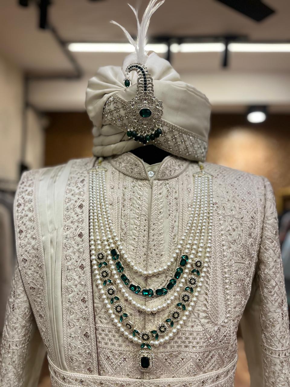 A magnificent blend of royal elegance and timeless artistry, this brooch features a graceful feather silhouette adorned with intricate gold-toned craftsmanship. The centerpiece showcases a rich emerald-hued stone, surrounded by delicate kundan-style detailing that enhances its regal charm. The upper arc is lined with fine green accents, while the base is beautifully finished with dangling emerald beads and pearl highlights, adding subtle movement and sophistication. Topped with a soft white feather, this brooch is a perfect statement accessory for grooms, adding a touch of heritage luxury to safa or sherwani styling.