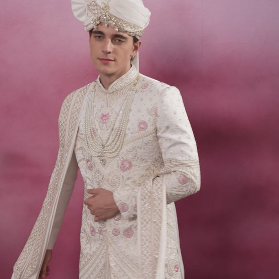 This elegant and majestic groom’s sherwani in ivory white is a perfect symbol of purity and sophistication. The ensemble features fine golden & dark pink thread embroidery in intricate geometric and floral patterns, creating a rich yet refined appearance. The sherwani is paired with a white churidar, a pleated inner kurta with a gold border, and a coordinated dupatta with matching embroidery. The regal look is enhanced with a white turban (safa) adorned with a brooch and feather, and a statement layered pearl necklace set. White embroidered juttis with gold motifs complete this graceful and royal attire.