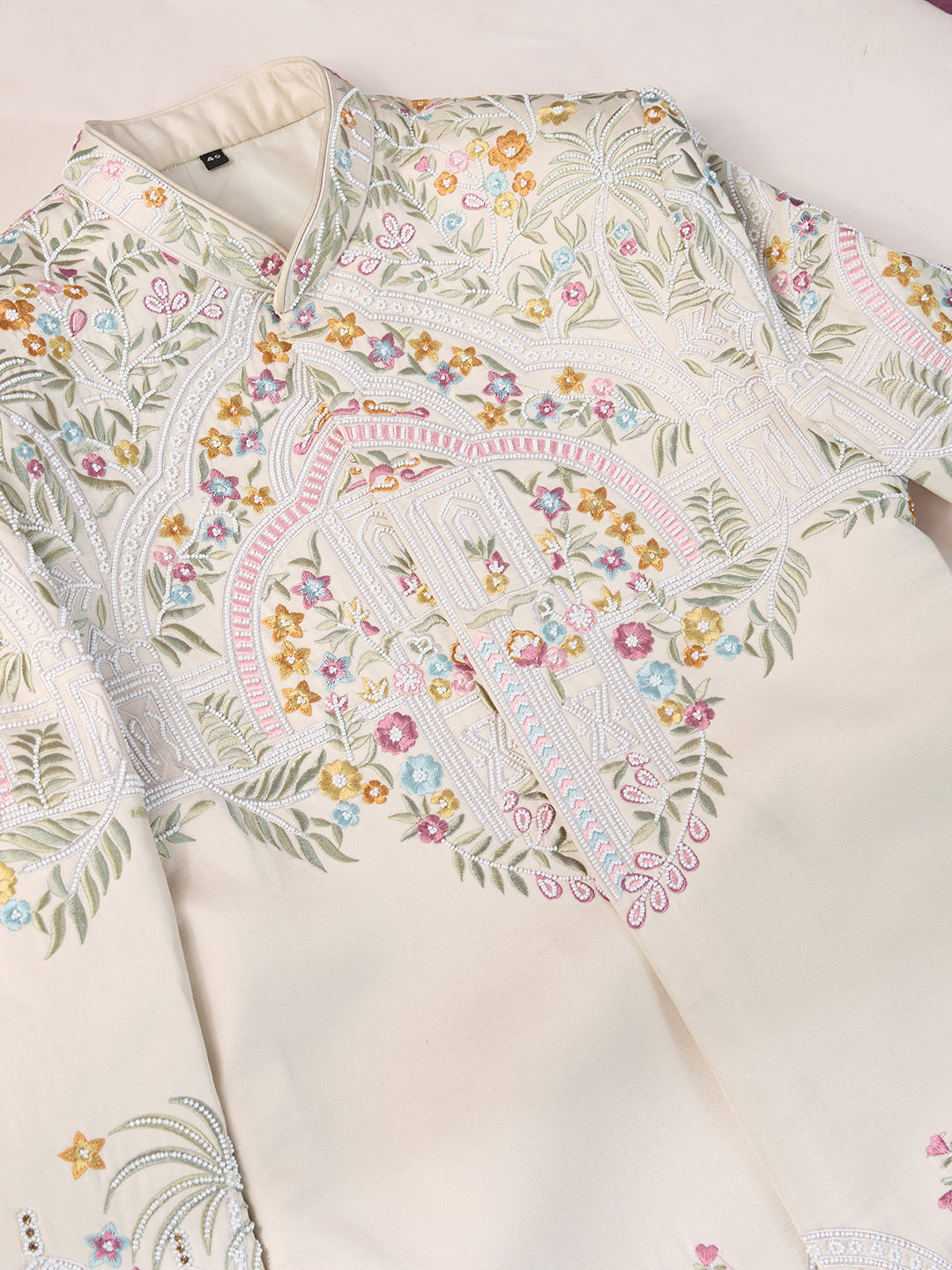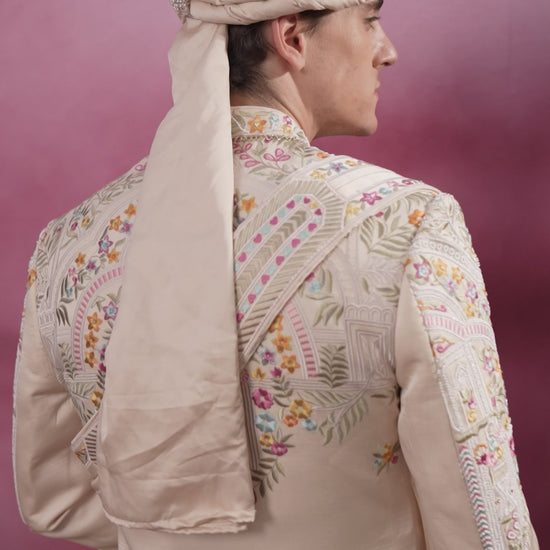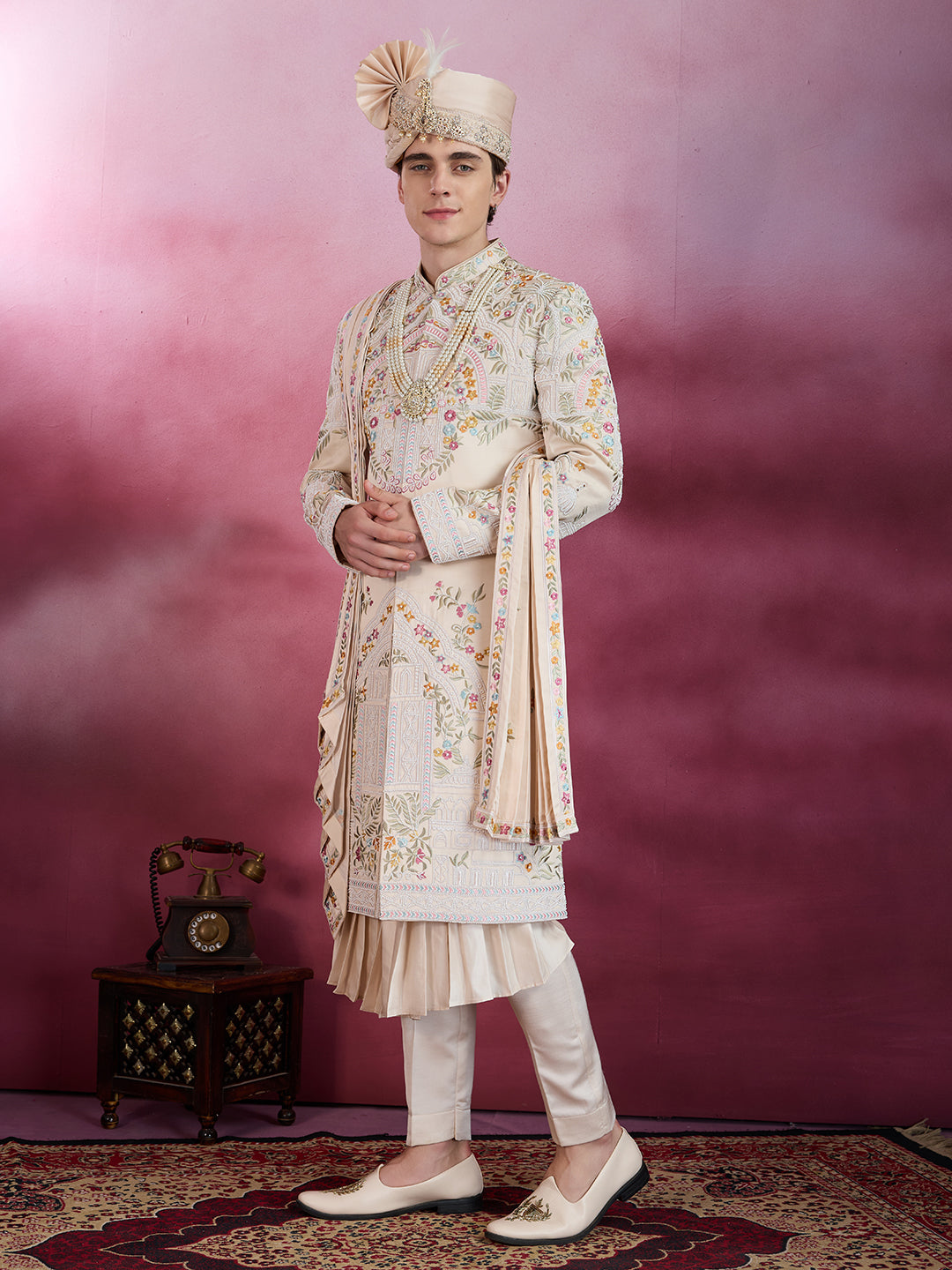 This traditional groom's ensemble exudes elegance and grandeur. The cream-colored sherwani features intricate multicolor floral embroidery with traditional Indian motifs and zari work, highlighting the artistry of Indian craftsmanship. The look is completed with a matching cream churidar, a pleated inner layer, and a coordinated stole draped over one shoulder. The outfit also includes a beautifully adorned turban (pagdi) with a brooch and feather, and cream embroidered juttis that elevate the regal look. The layered pearl necklace adds an extra touch of royalty.