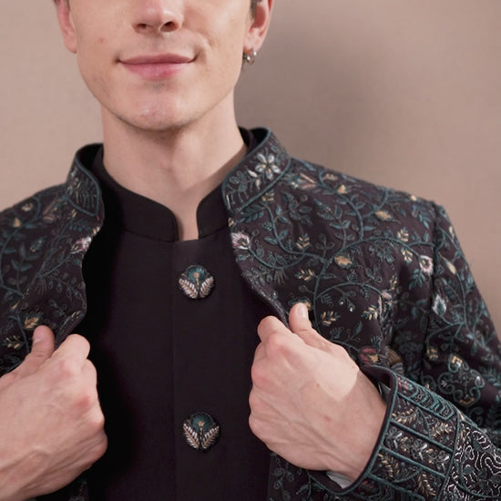 This elegant Indo-Western ensemble features a deep Wine imported fabric with a richly thread embroidered. The jacket is adorned with intricate thread work and metallic accents in shades of blue and gold, adding a regal touch. Designed with a mandarin collar and embellished buttons, it blends modern sophistication with traditional charm. Perfect for weddings, receptions, and festive occasions, this outfit makes a classy statement for the modern groom or wedding guest.